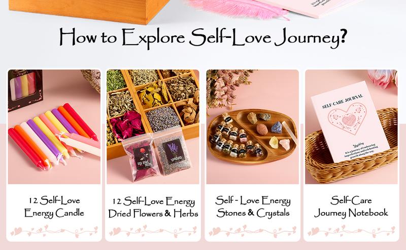 🌹 Self-Love Ritual Supplies: Self-love witch starter kit with 36 Page detailed guidebook, 12 safe dried plants for sensory exploration, 6 kinds of color spell candles, raw stones and crystals for using in self-love. Designed for affirmation meditation, enhance your happiness, practice gratitude, foster compassion, release and healing, ultimately achieve self-love.
