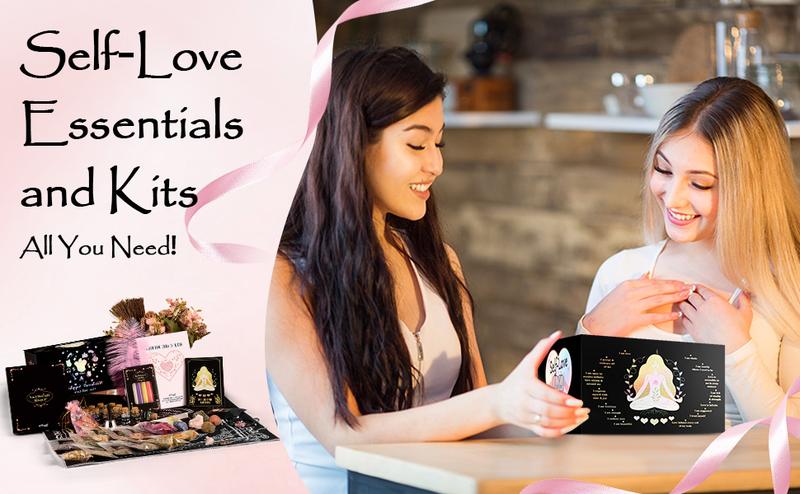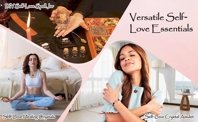 💖New Theme Self-Love Ritual Kit: 30 days self-care journal workbook, 30+ Positive Messages Capsule in a Bottle,12 botanical/herbal blends (lavender, rose petals), 12 crystals for beginners in spell jars, 6 healing raw stones, 12 Spell candle (6 colors), 12 parchments, necklace and bracelet, rose quartz pendulum, selenite wand, self-love pink salt, altar tarob, hand bell, broom, pink ostrich feather.